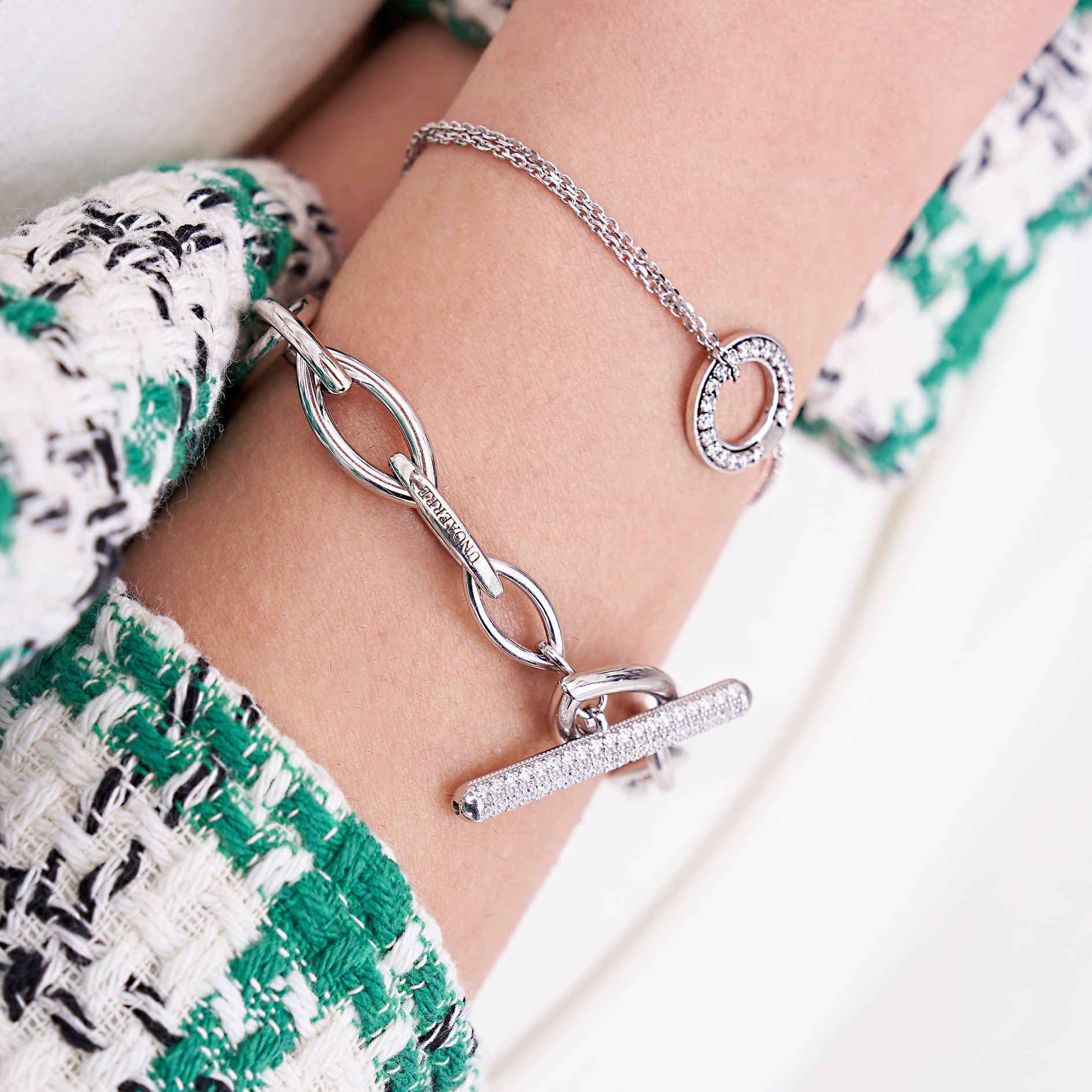 Bracciale in argento bianco 925 lungo 20 cm composto da catena forzatina, centrale tondo con pietre zirconia cubica bianche e chiusura a moschettone.