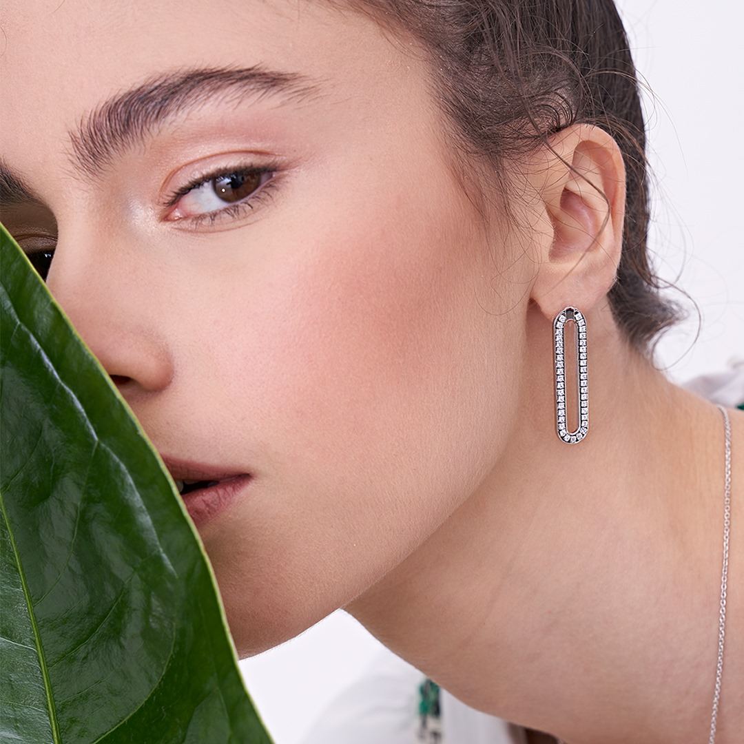 Orecchini in argento bianco 925 a forma di maglia ovale lunga 3,50 cm con 41 pietre zirconia cubica bianche e chiusura al lobo con perno e farfallina.