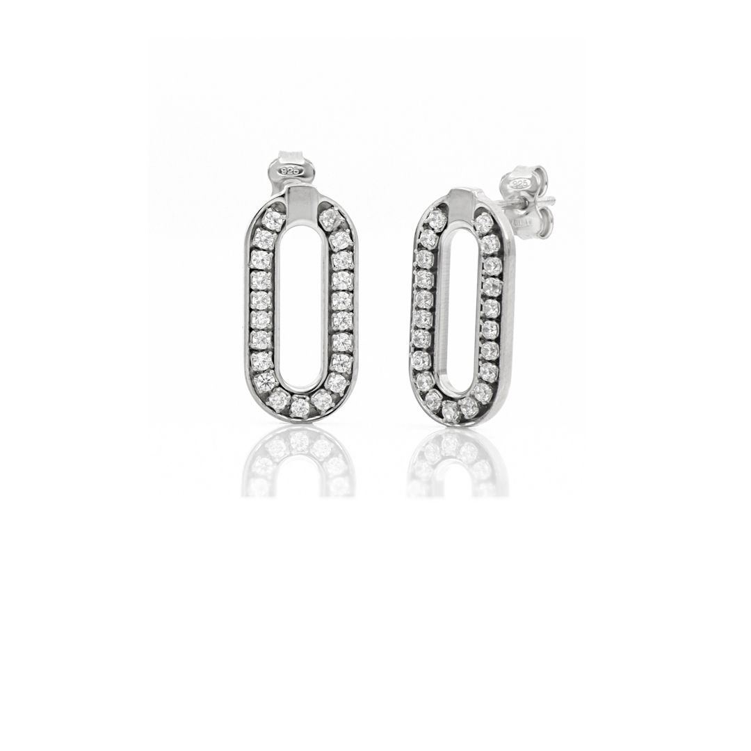 Orecchini in argento 925 con maglia paper clip, zirconia cubica bianca e chiusura con perno e farfallina.