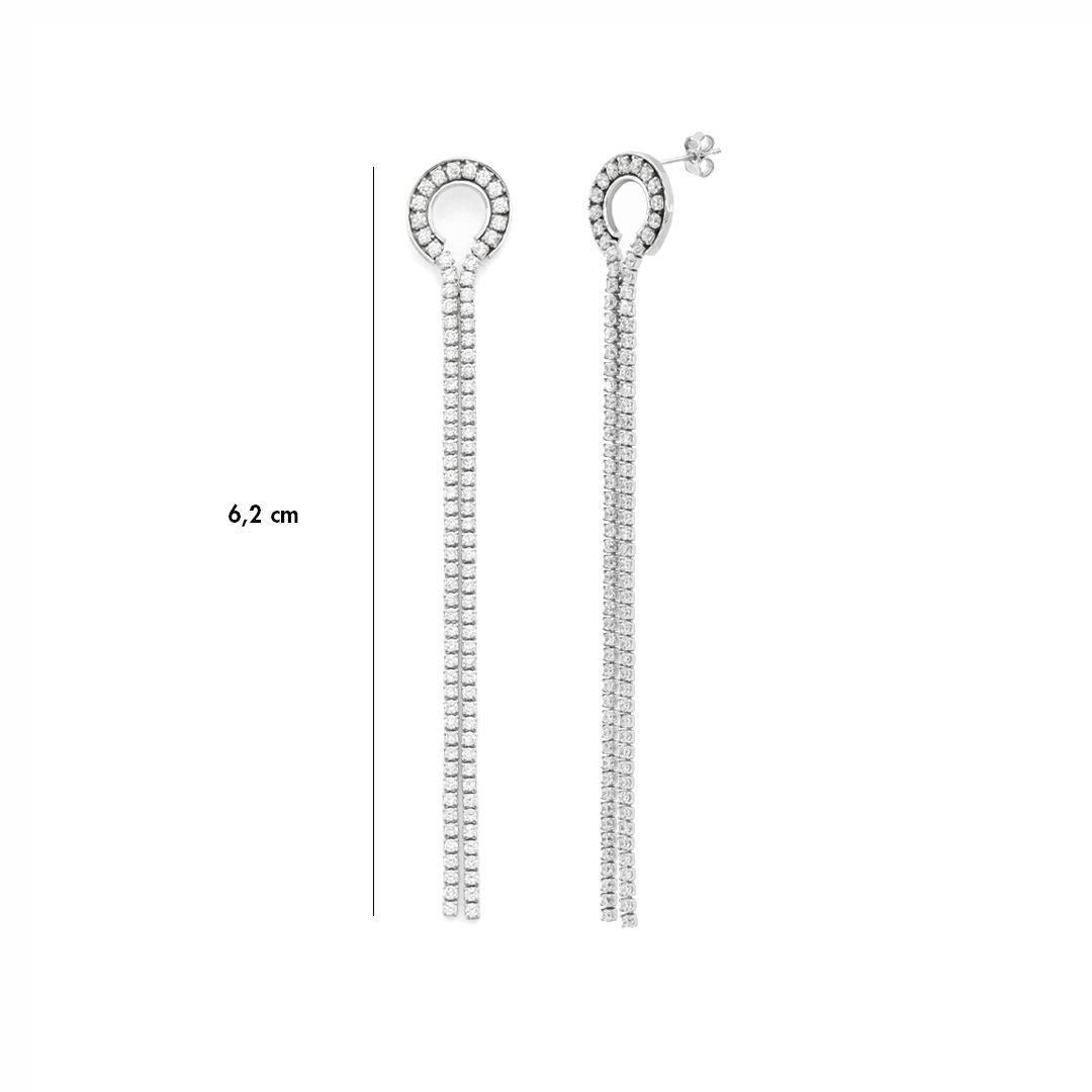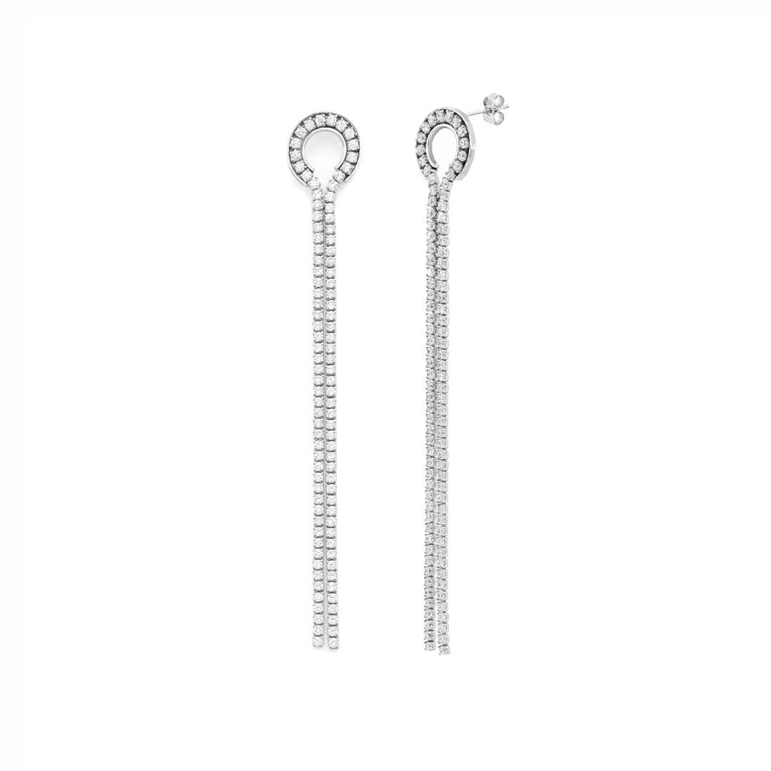 Orecchini lunghi in argento 925 con elemento a cerchio di diametro 1,10 cm e pietre zirconia cubica bianche. Chiusura al lobo con perno e farfallina.