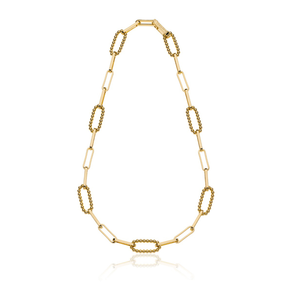 La catena a palline impreziosisce la collana e la pratica chiusura a gancetto permette di regolarne a piacere la lunghezza.